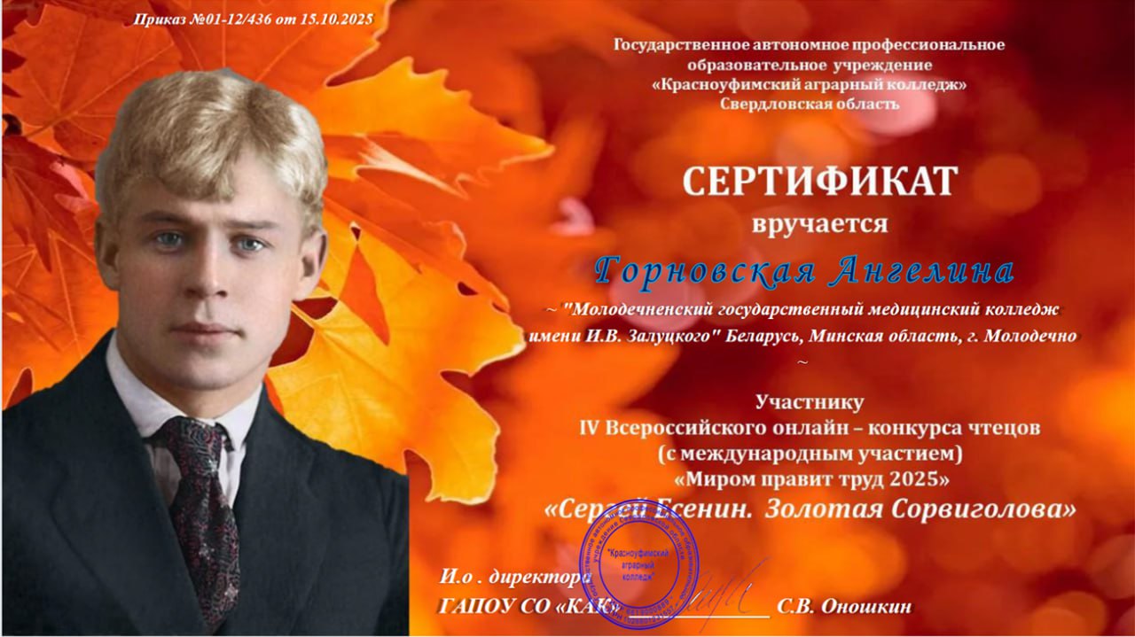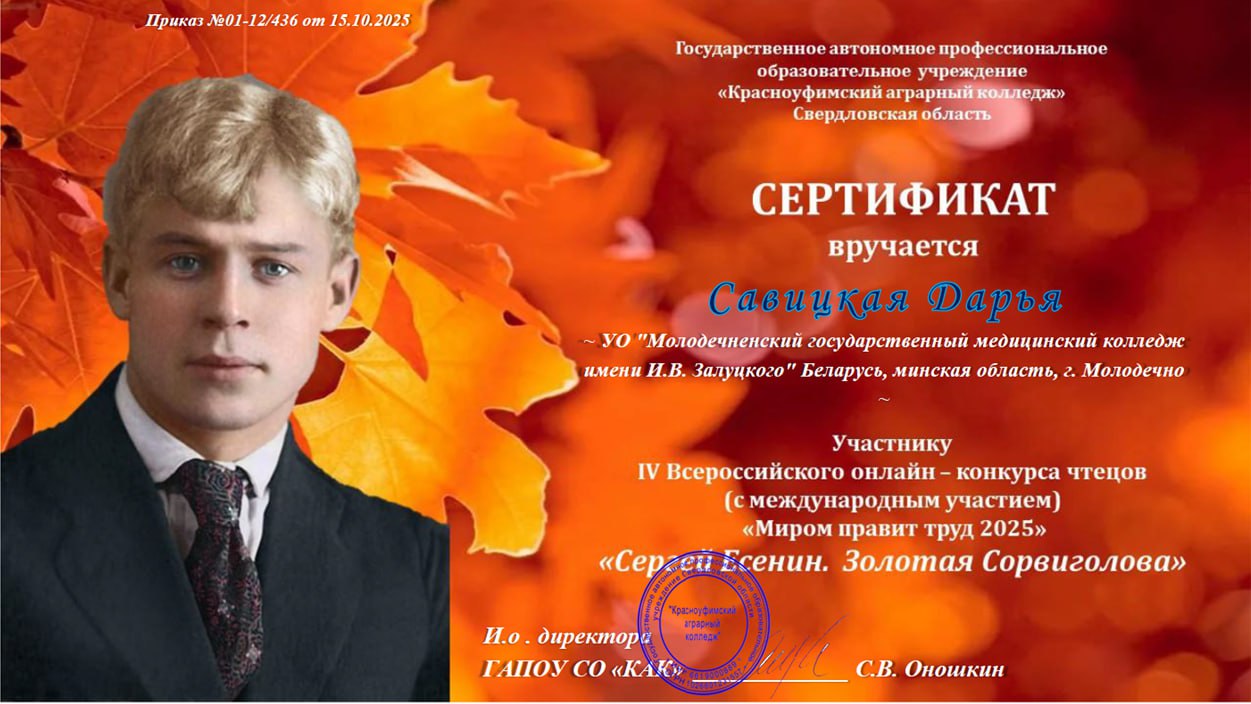 Учащиеся группы ЛД(б)-11 Савицкая Дарья Сергеевна, Жук Лиана Сергеевна, Горновская Ангелина Сергеевна под руководством преподавателя Карташевич Екатерины Олеговны приняли участие в IV Всероссийском онлайн – конкурсе чтецов «Миром правит труд». Организатор ГАПОУ СО «Красноуфимский аграрный колледж».
