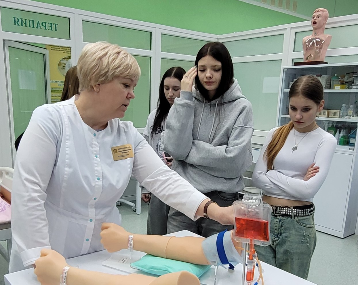 Заведующий лабораторией по отработке навыков Александра Котович провела экскурсию по лаборатории. Учащиеся смогли выполнить некоторые медицинские манипуляции.